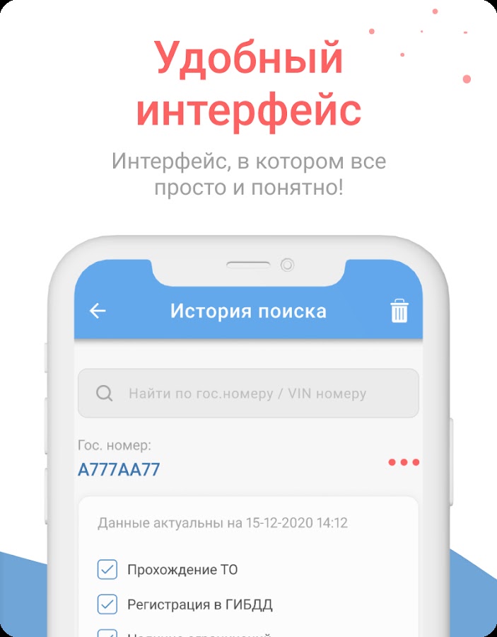 Проверить можно машину, зарегистрированную в любом регионе РФ. Информация отображается в мобильном приложении, сохраняется история поиска авто и история отчетов. Отчет о автомобиле также будет отправлен на электронную почту.