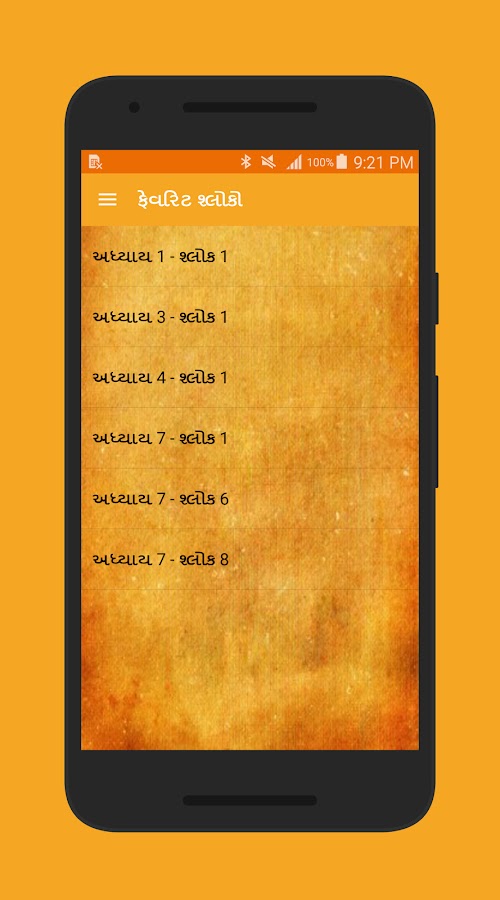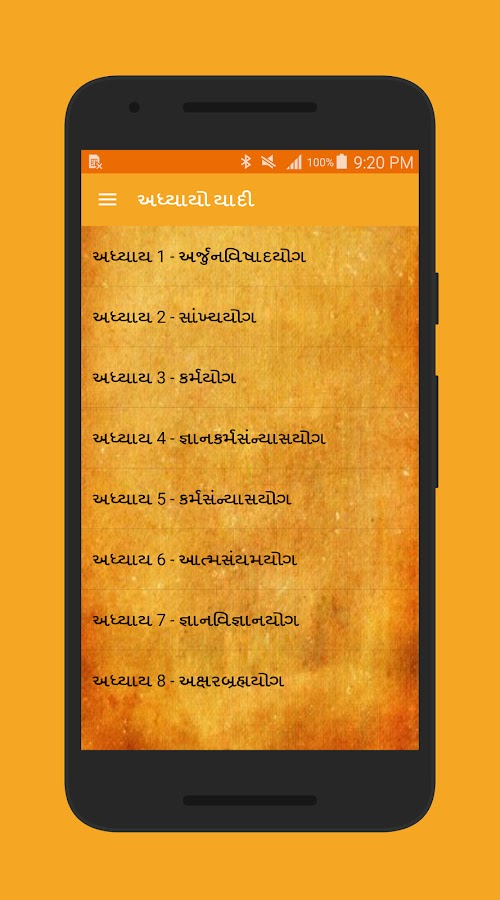 Единственный доступный Гуджаратский перевод Бхагавадгитов сделан доступным на этом приложении. Можно было бы получить огромное удовольствие, просто читая гуджаратскую версию, как это сохранить в неприкосновенности сюжет. Мелодия и метры поэзии также не точно воспроизведены в гуджаратском все же, в их собственном, они довольно последовательны.