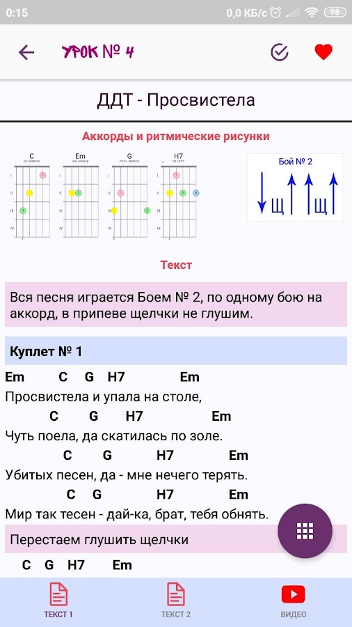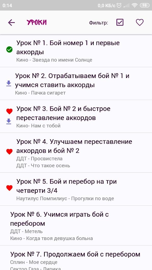 В приложении собраны уроки, проходя которые ты постепенно, шаг за шагом, освоишь все приемы игры на гитаре. Уже на пятом уроке ты будешь уметь играть три боя и перебор, а за следующих три урока освоишь бой с перебором и игру на баррэ! Всего уроков на данный момент — 49!