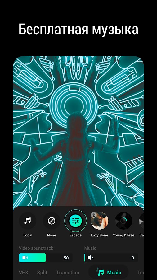 Разнообразная ритмичная музыка, забавные звуковые эффекты, создающие атмосферу вашего видео. Саундтрек редактируемый, вы можете легко подрезать или отрегулировать громкость музыки, затемнить или уменьшить ее. Пользователи также могут загружать локальную музыку, создавать видео со своими любимыми песнями или даже извлекать саундтрек из других видео. Glitch FX поможет вам создать самые очаровательные музыкальные клипы.