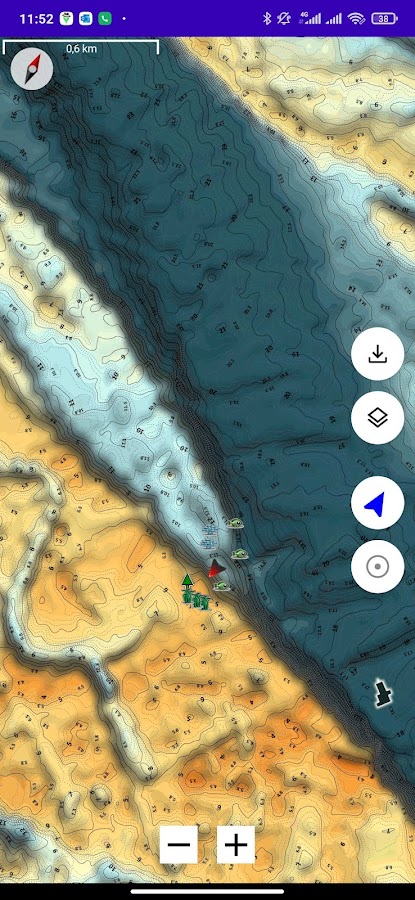 Приложение отображает ваше текущее местоположение относительно подводного рельефа. Что существенно облегчает поиск перспективных мест ловли рыбы.