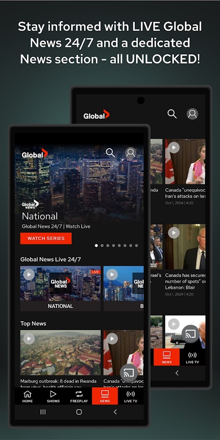 Плюс будьте в курсе новостей Global News — это дает вам круглосуточный доступ к местным и национальным новостным потокам по всей Канаде, включая: Британская Колумбия, Торонто, Эдмонтон, Калгари, Оканаган, Питерборо, Монреаль, Галифакс, Виннипег, Реджайна, Саскатун, Кингстон, Летбридж и National.