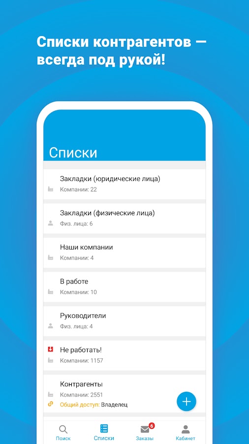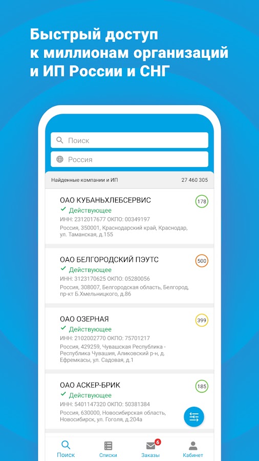 Поиск по названию, адресу, ФИО руководителя и другим реквизитам.