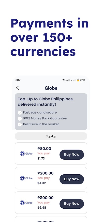 Клиенты Globe Telecom — покупайте предоплаченные нагрузочные кредиты для своих телефонов на Филиппинах или во время путешествия по США.