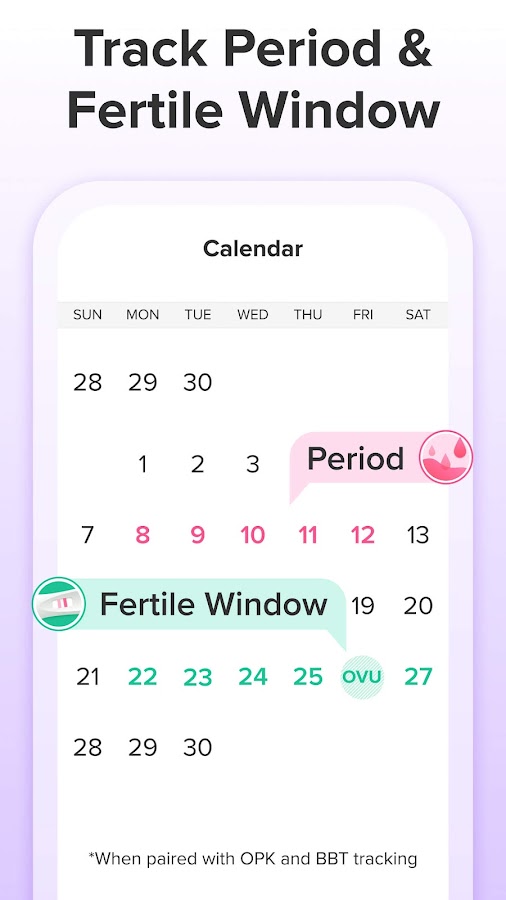 + Пятидневная и ежемесячные просмотра календаря показать свой следующий плодородную окно, овуляция дней, и предстоящий период.