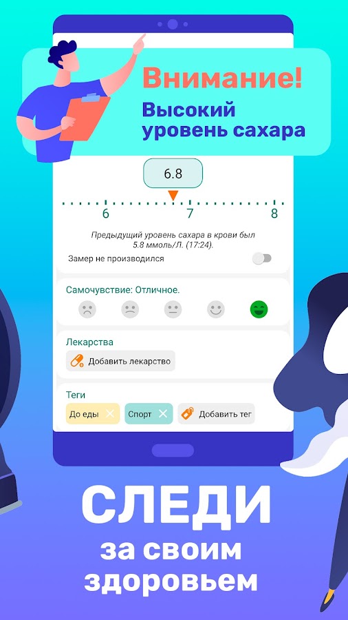 Дневник сахара позволит Вам фиксировать свои регулярные замеры и показатели инсулинового индекса – отслеживать уровень глюкозы и гемоглобина, уровень хлебных единиц, потреблённых в течение дня. Назначайте каждой записи теги, для удобства отслеживания динамики: ведите календарь приема лекарств (учет инсулина), фиксируйте уровень инсулина свое эмоциональное состояние и вес.