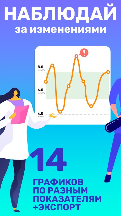 ★ Приложение для сахарного диабета учитывает специфику каждого отдельного человека, позволяет гибко настраивать нормальные для вас уровни глюкозы и гемоглобина — журнал диабета автоматически проанализирует введенные показатели и их динамику.