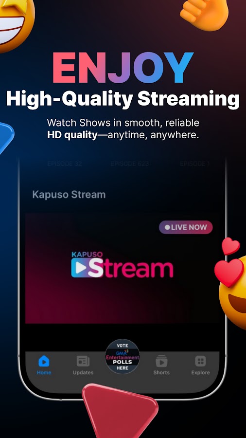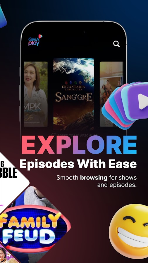 GMA Play объединяет прямые трансляции телеканалов GMA, филиппинские шоу по запросу, азиатские драмы, филиппинские и зарубежные фильмы в одном потоковом приложении, созданном для филиппинцев.
