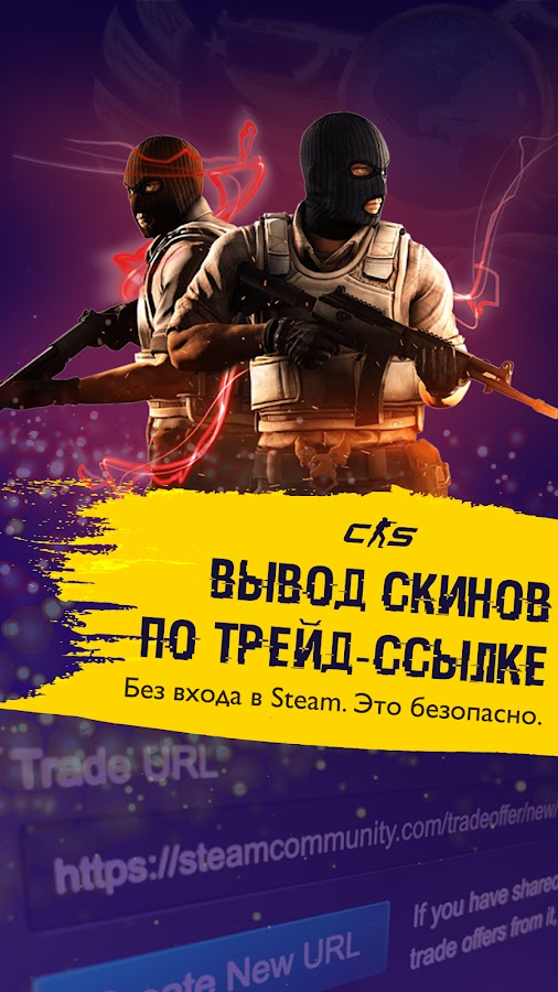 Вывод бесплатных скинов в Steam происходит по твоей трейд ссылке. Входить в аккаунт не нужно, а значит это безопасный способ обновить свой инвентарь в cs:go и cs 2 новыми яркими скинами.