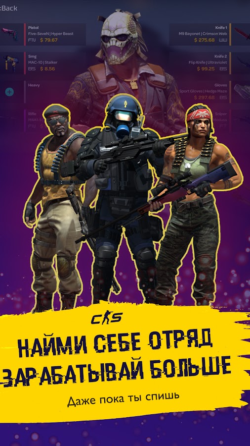 Нанимай солдат в команду, экипируй своим инвентарем и собирай прибыль каждый час! Чем лучше прокачен отряд, тем больше денег он приносит. Соревнуйся с игроками в опыте, суммами на балансе и стоимостью инвентаря!