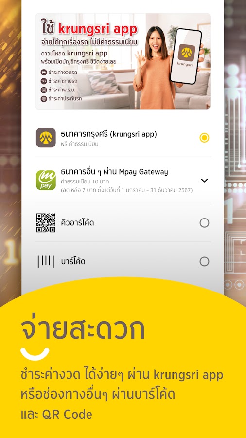 — Служба проверки и оплаты очередного платежа за автомобиль с помощью штрих-кода и QR-кода или выбор оплаты через приложение Krungsri, служба Mpay через 5 основных банков