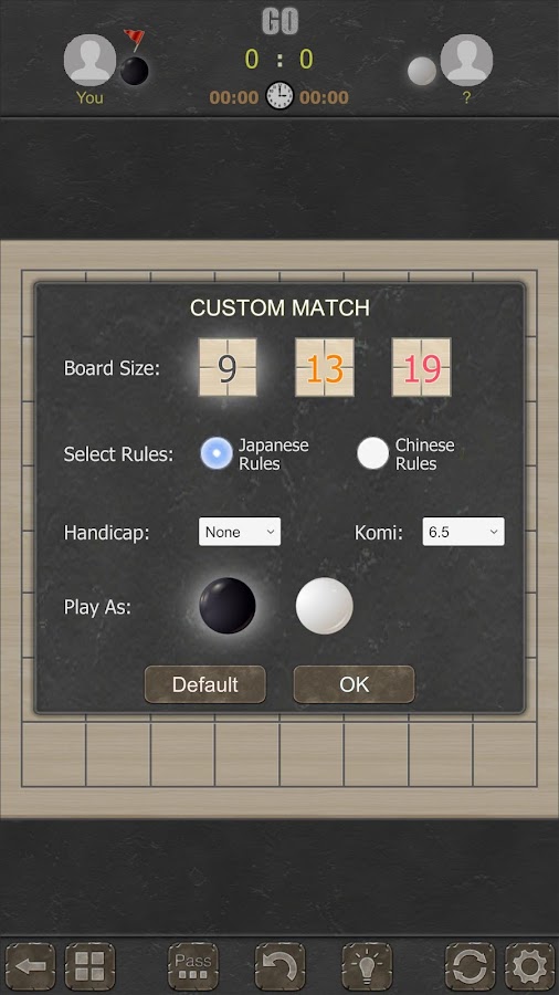 — Пользовательский размер доски, гандикап, коми, черный камень или белый камень.