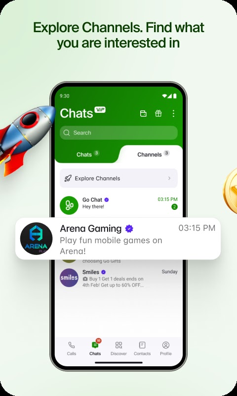 Эксклюзивные награды: используйте приложение, чтобы заработать монеты GoChat Coins для бесплатных мобильных данных, VIP-подписок и премиальных стикеров!