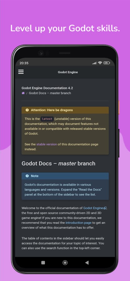 Добро пожаловать в Godot Docs, ваше подробное руководство по Godot Engine, мощной платформе разработки игр с открытым исходным кодом. Godot Docs — это приложение для Android, которое предоставляет официальную документацию Godot Engine прямо у вас под рукой, позволяя получить доступ к ценным ресурсам и руководствам на вашем телефоне.