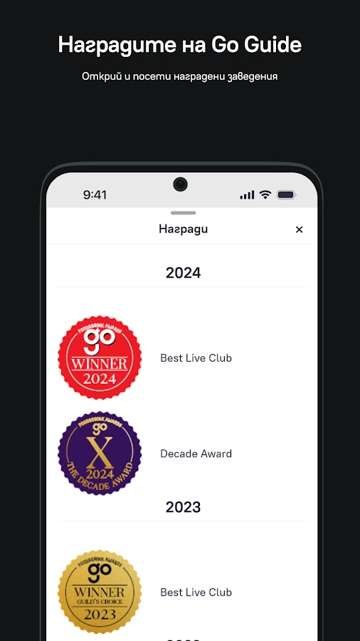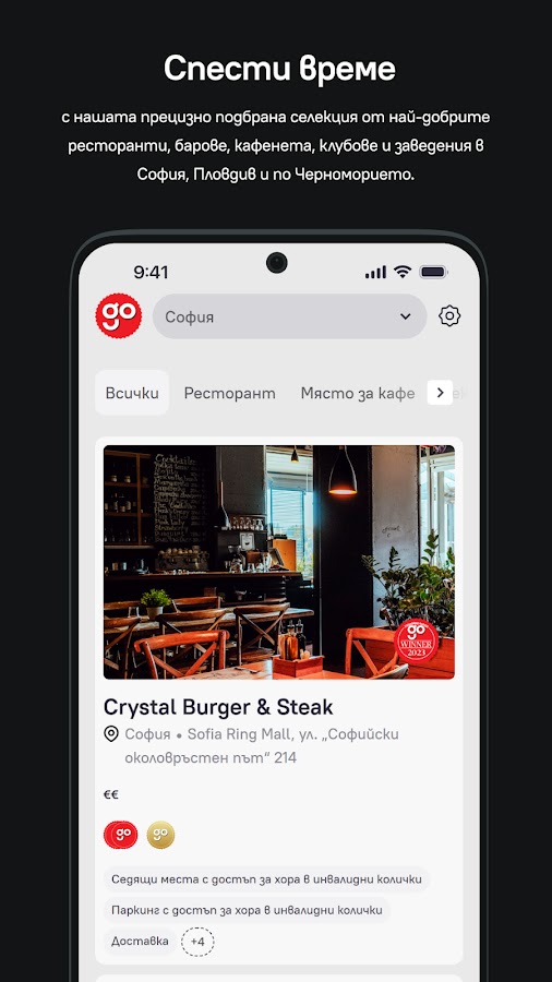 Go Guide с 20-летней историей — ведущее издание, посвященное образу жизни, которое служит своего рода путеводителем по городу для современного человека. Теперь оно появилось в еще более удобном формате — в приложении Go Guide! Приложение сэкономит время, предложив точно подобранную подборку лучших ресторанов, баров, кафе, клубов и заведений Софии, Пловдива и Черного моря. Все рекомендованные места были отобраны и отобраны командой Go Guide, причем некоторые из них отмечены отличительными наклейками Go Food & Drink Awards: Приз зрительских симпатий, Приз Гильдии и Приз десятилетия.