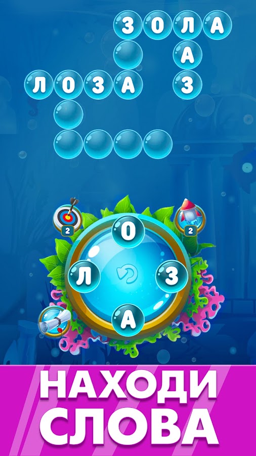 Мы сделали филворды интереснее! Играть в “Золотые слова” — значит не только искать слова и пополнять словарный запас, но и наслаждаться атмосферной графикой! Погружайся в подводный мир, чтобы угадывать слова и зарабатывать монеты. А на них собирай коллекцию разнообразных морских обитателей для своего аквариума!