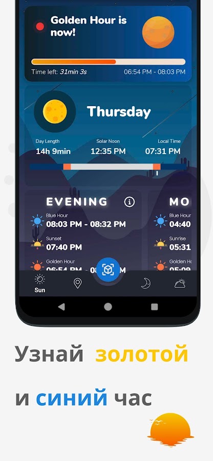 ⏰ настраивайте уведомления о золотом часе и других фазах солнца