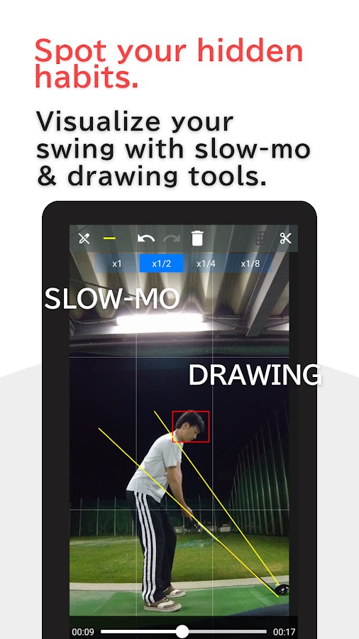 ▼ Анализ с помощью встроенных инструментов рисования. Движение головы, наклон оси и плоскость свинга. Рисуйте линии, круги или штрихи от руки, чтобы объективно проверить движение вашего тела. Пора попрощаться с бесцельными тренировками.