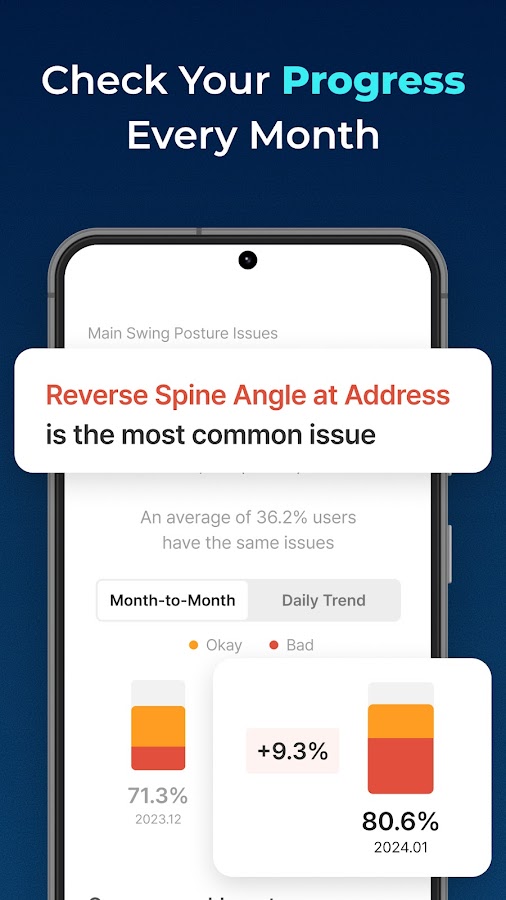 — Просматривайте свой средний балл за осанку за месяц и сравнивайте самый низкий и самый высокий результат замаха.