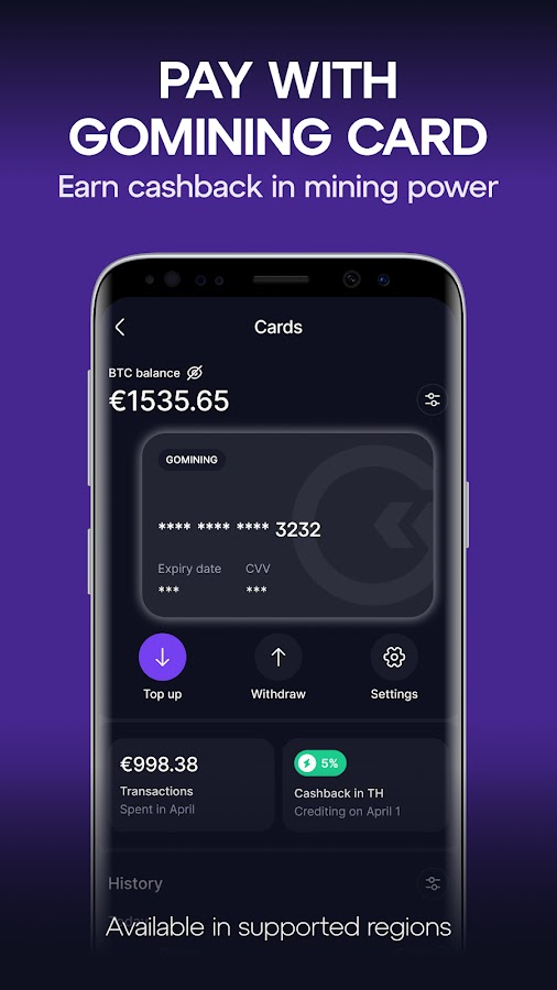GoMining Card — это удобный и выгодный способ использовать баланс в повседневной жизни (доступно в поддерживаемых регионах). Карта интегрирована непосредственно в приложение GoMining и позволяет совершать покупки везде, где принимаются банковские карты. Каждая транзакция становится более ценной благодаря кэшбэку в майнинговой мощности и прозрачной фиатной конверсии. Карта бесшовно интегрируется с майнинговыми и другими продуктами экосистемы GoMining, создавая единый пользовательский опыт как для давних пользователей, так и для новичков.