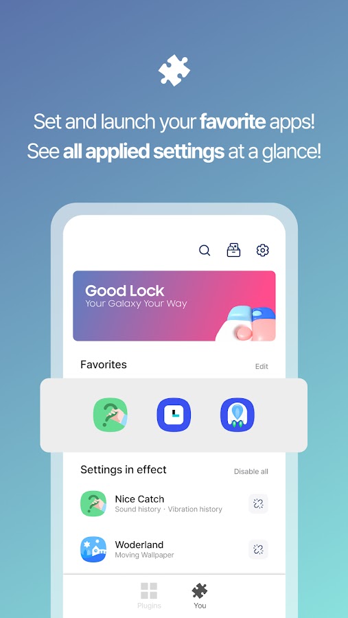 С помощью плагинов Good Lock пользователи могут настраивать пользовательский интерфейс строки состояния, панели быстрого доступа, экрана блокировки, клавиатуры и т. д., а также более удобно использовать такие функции, как многооконный режим, звук и подпрограммы.