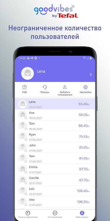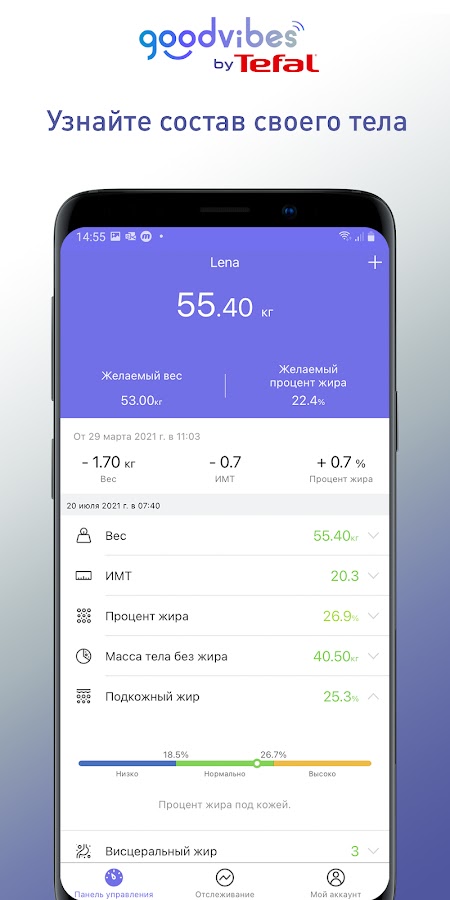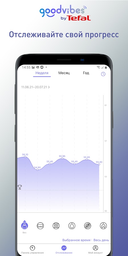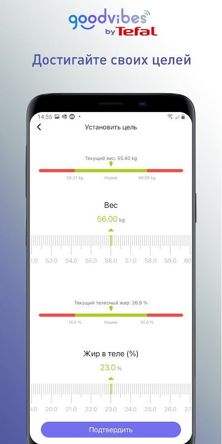 Приложение Goodvibes работает с подключенными к нему весами Goodvibes от Tefal. Это интуитивно понятное в использовании приложение позволит вам с легкостью узнать состав своего тела и отслеживать свой прогресс!
