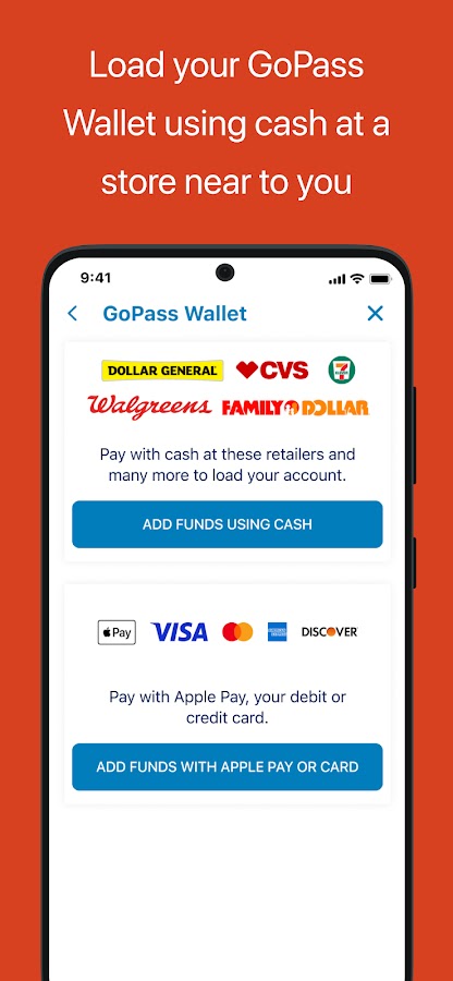 — Опция «Наличные на мобильный телефон», позволяющая вам загружать наличные в свой кошелек GoPass в розничных точках.