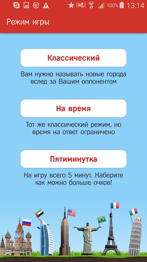 — «Обычная игра» — классический режим, в котором Вам необходимо последовательно называть города, за что Вам будут начисляться очки.