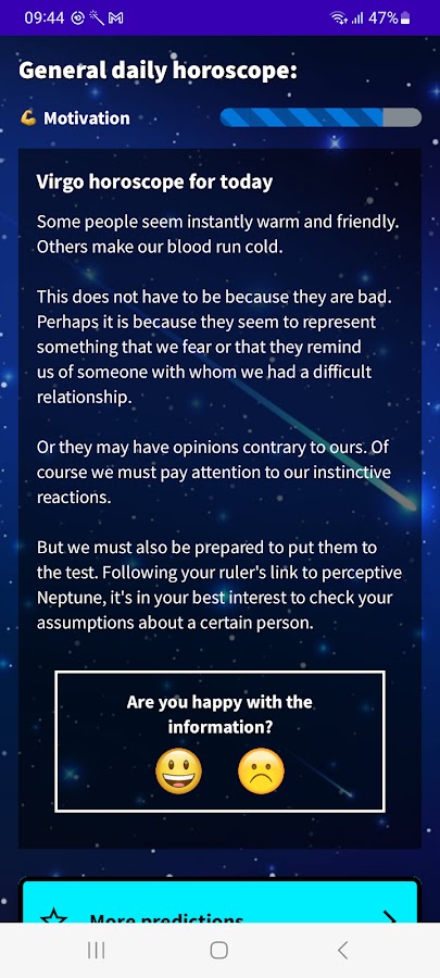 Узнайте, каким будет ваш день, с нашим ежедневным гороскопом Девы на 2026 год! Загрузите наше бесплатное приложение из Google Play и получите доступ ко всей астрологической информации, необходимой для планирования дня заранее. С нашим приложением вы узнаете свое счастливое число, счастливый цвет, счастливый знак, эволюцию своего состояния, ежедневную мотивацию, романтическое и финансовое настроение. Не ждите больше! Загрузите наше бесплатное приложение астрологического гороскопа Девы и начните пользоваться всеми его преимуществами.