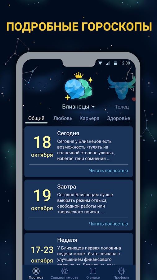 Будьте в курсе того, что подготовили звезды для вас и для ваших близких: читайте гороскопы для своего знака и для знаков родственников или друзей. Это очень легко и быстро: просто добавьте важные для вас знаки Зодиака в любимые — приложение запомнит ваш выбор и вам не придется выбирать их вручную каждый раз! Если захотите, вы также сможете поделиться гороскопом с близкими — буквально в пару кликов!