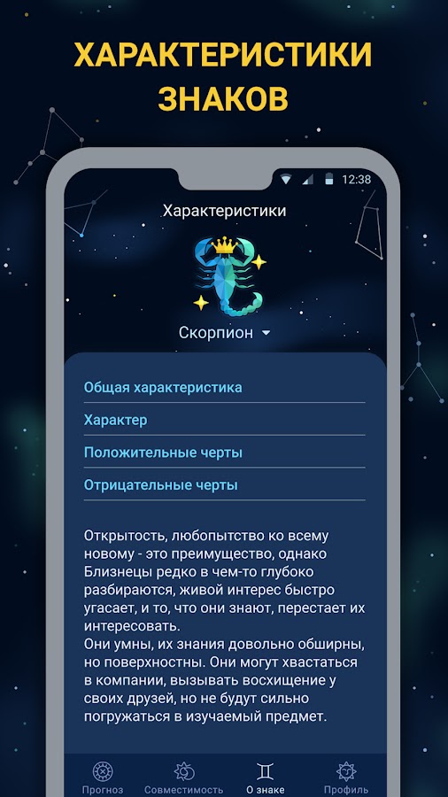 Приложение содержит точные предсказания и астрологические прогнозы для всех знаков Зодиака: Овен, Телец, Близнецы, Рак, Лев, Дева, Весы, Скорпион, Стрелец, Козерог, Водолей, Рыбы.