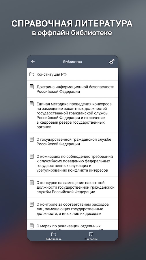 Приложение содержит новые вопросы Минтруда теста Госслужбы с разъяснениями по всем темам, нормативные правовые акты и литературу, а также симулятор экзамена для госслужащих как на комиссии.