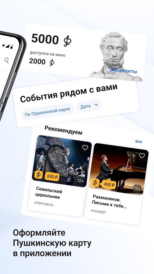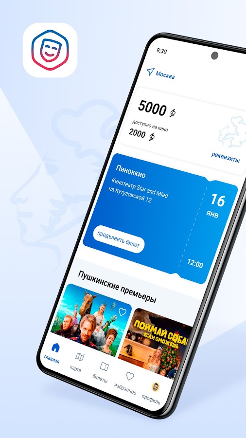 Выпустите бесплатно «Пушкинскую карту» с балансом 5000 ₽ и посещайте кино, музеи, театры и концертные залы за счёт государства. Карта действует для молодых людей от 14 до 22 лет