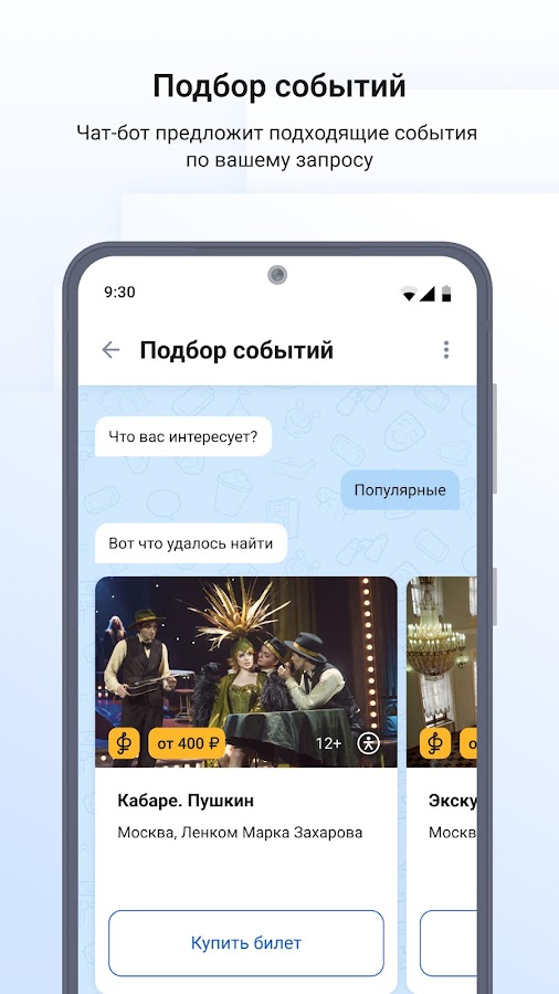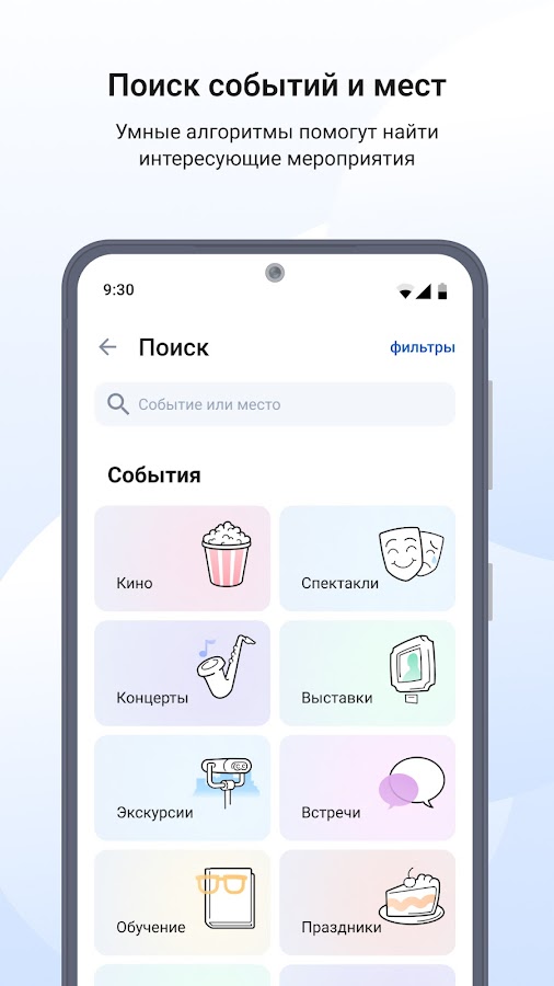 Вы не пропустите интересный фильм, концерт или выставку, где бы не находились. Выберите нужный регион и узнавайте о предстоящих событиях. Приложение покажет, какие из них проходят рядом