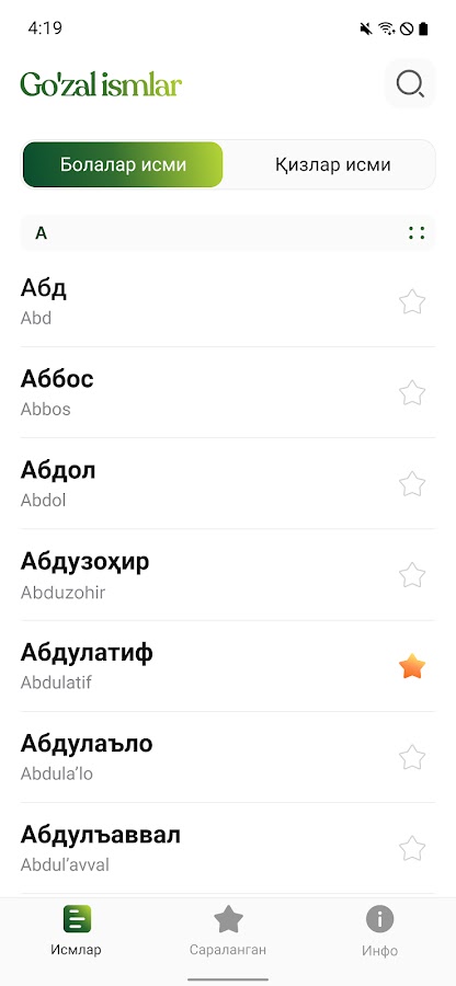 Скачайте приложение Go’zal Ismlar для Android бесплатно - последняя версия (1.0.4) уже доступна для установки на ваш телефон или планшет.