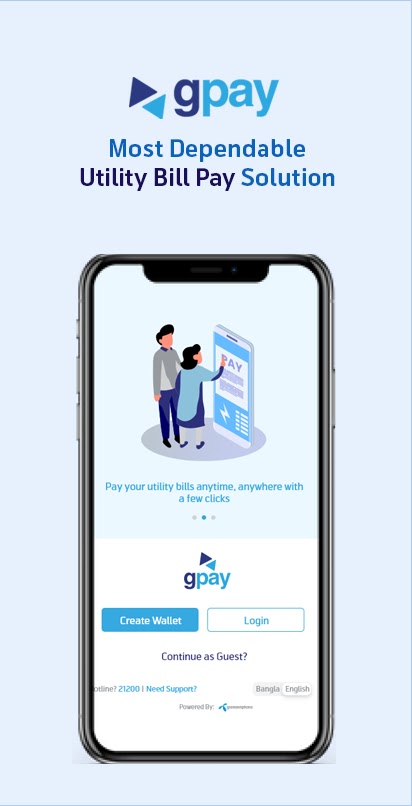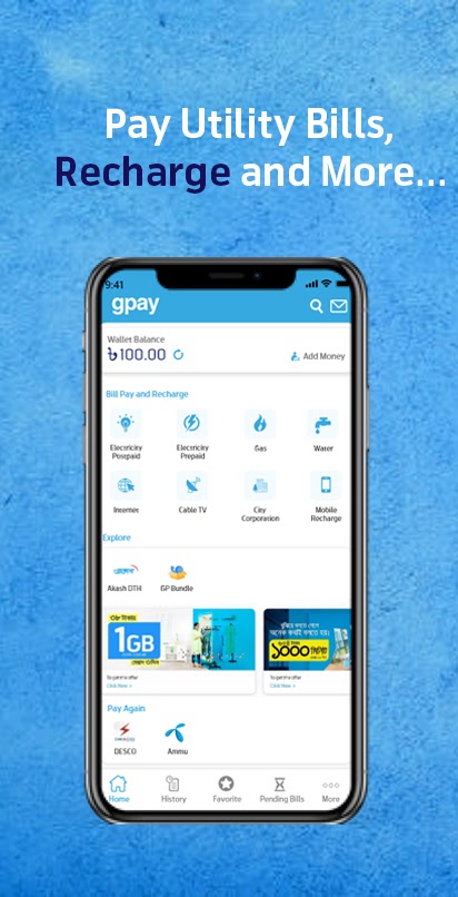 GPAY является мобильный кошелек, что клиенты любого числа Grameenphone можно использовать для пополнения баланса своего GP мобильные номера, осуществлять платежи счетов за коммунальные услуги (электричество, газ или вода), а также приобрести билеты на поезд из своего собственного мобильного телефона. Чтобы использовать GPAY, клиенты должны зарегистрироваться, используя мобильное приложение GPAY (из магазина Google Play) или просто наберите * 777 # с помощью любого устройства. После того как вы зарегистрировались, вам разрешено делать платежи. Для того, чтобы пополнить свой кошелек GPAY вы можете использовать свои банковские счета (Rocket, АО банк, Ислами банк), или если у вас нет какой-либо счет от этих банков, то вы можете посетить любой MobiCash розетку. Для удобного платежного решения начать использовать GPay с сегодняшнего дня и открыть окно возможностей вашего времени и денег.