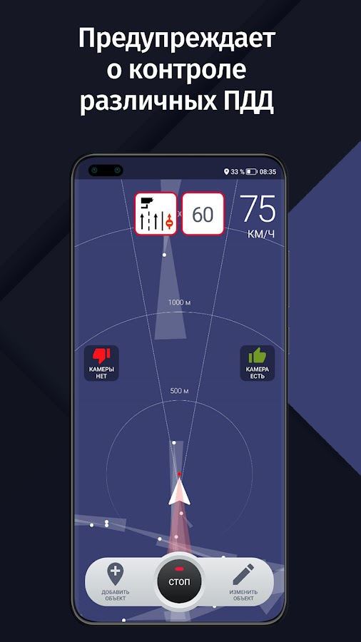 Приложение работает с помощью известных данных о расположении стационарных камер и радаров ДПС (такие как Стрелка или Старт СТ) и других объектов. В PRO версии есть возможность добавить недостающие камеры вручную и синхронизация их между пользователями! Вам не нужно ждать пока мы добавим камеры, она пополняется просто и удобно самими пользователями!