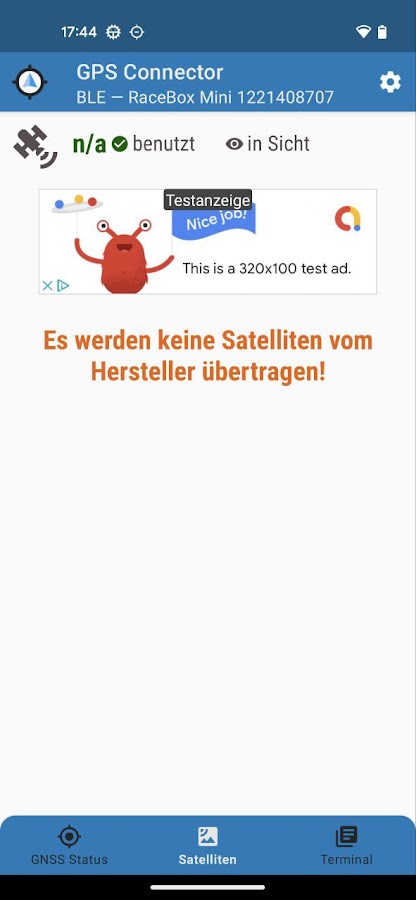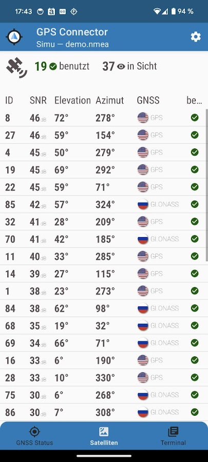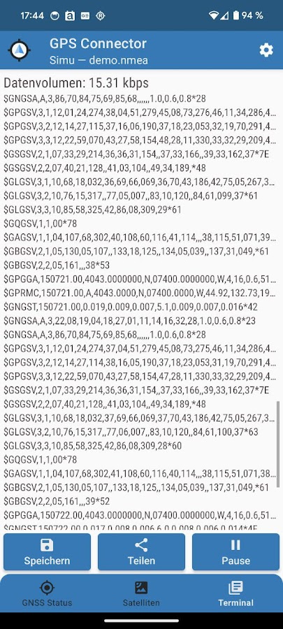 Приложение подключает любой высококачественный GNSS-приемник через Bluetooth Classic, Bluetooth Low-Energy, USB или TCP-IP и предоставляет текущую позицию любому навигационному приложению на Android посредством «насмешки». Приложение полезно, если навигационные данные NMEA с внешней GPS-антенны должны быть доступны другим приложениям Android.