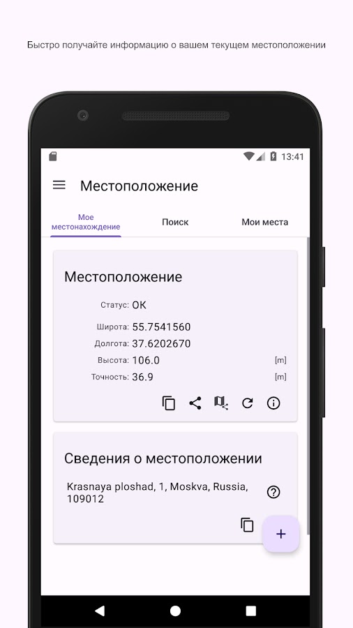 GPS искатель позволяет быстро получать и делиться текущее местоположение (GPS координаты или адрес).