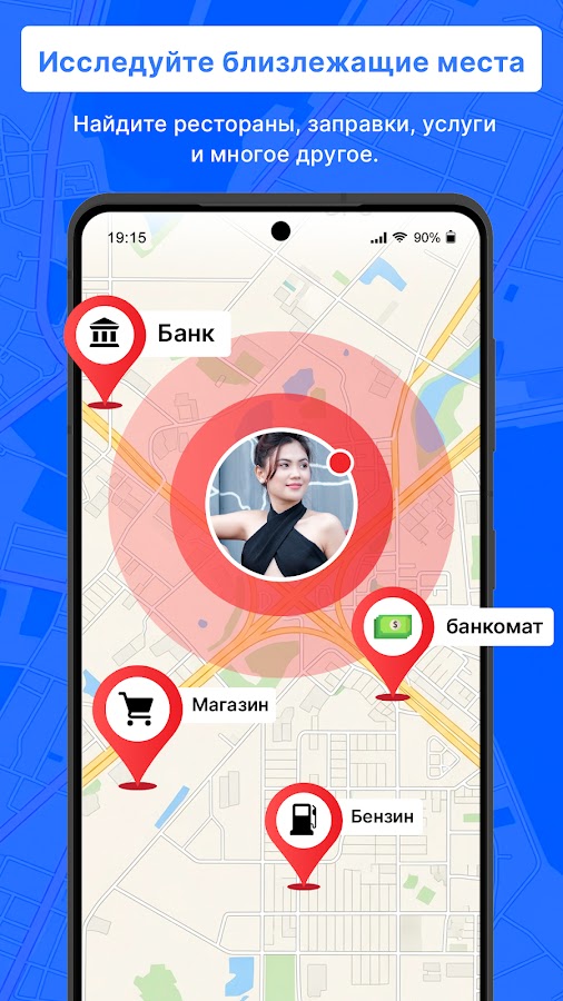 • Найдите близлежащие места, такие как рестораны, банкоматы и заправки.