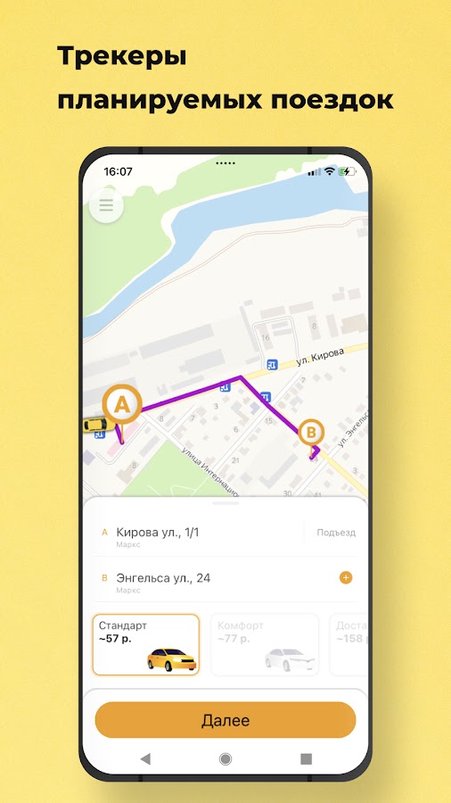 📱 Следите за поездкой на карте. Приложение сообщит время подачи, марку, цвет, номер машины, а также имя водителя.