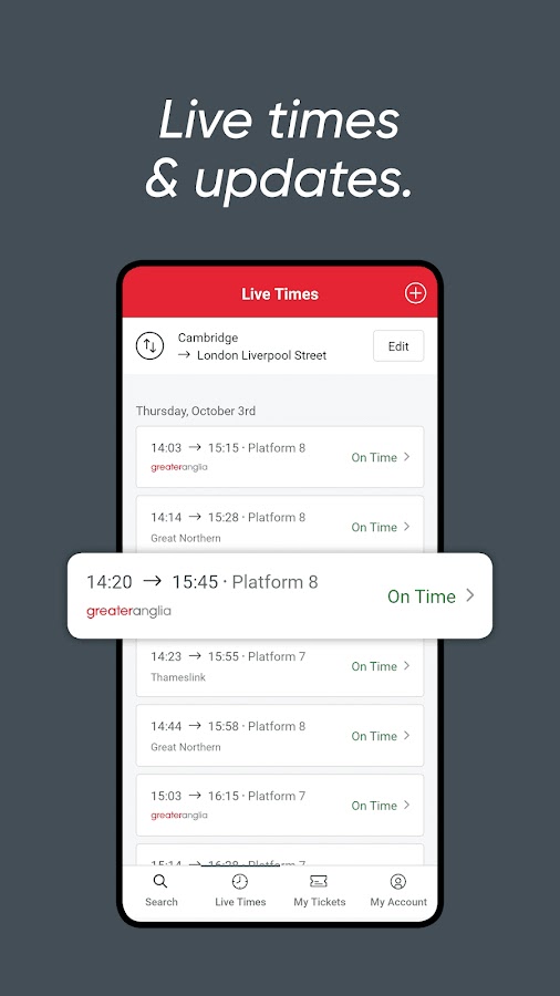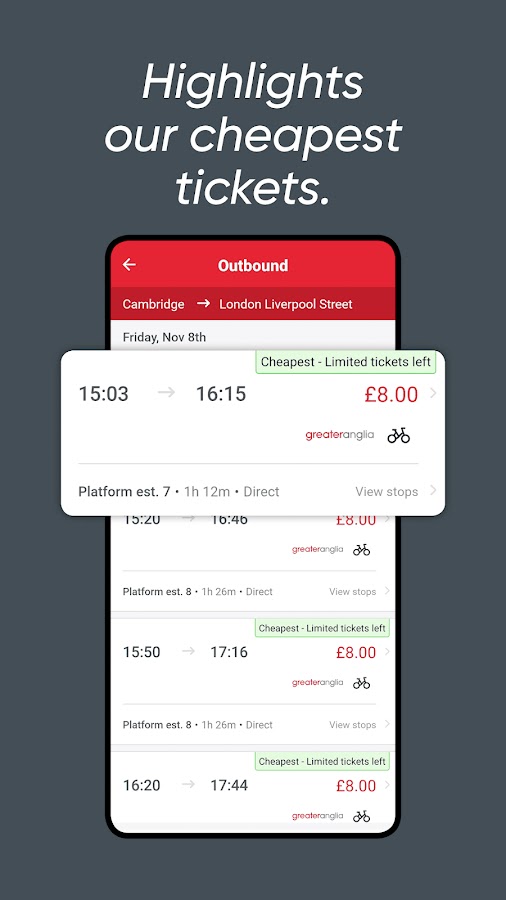 Приложение Greater Anglia похоже на билетный автомат в вашем кармане. Он прост в использовании, поэтому вы сможете сэкономить время и избежать очередей на станции. Кроме того, выделен самый дешевый билет, и мы не взимаем комиссию за бронирование или оплату картой!