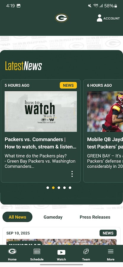 Новости: получайте новости в режиме реального времени непосредственно от Packers, включая анонсы предстоящих матчей, истории после игр и углубленный анализ.