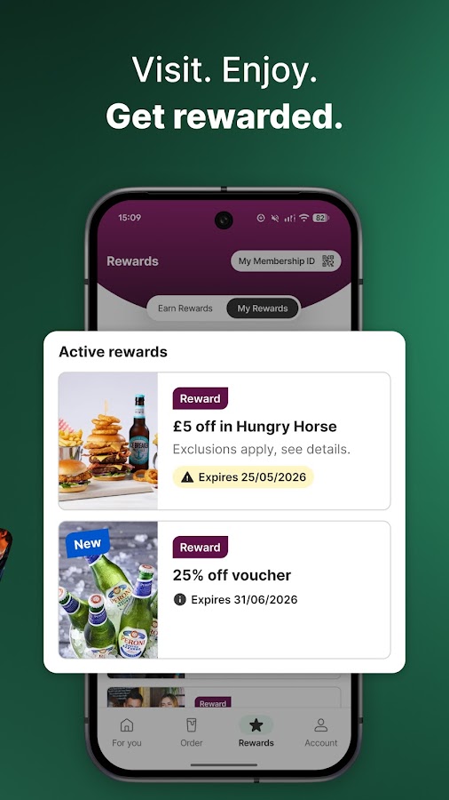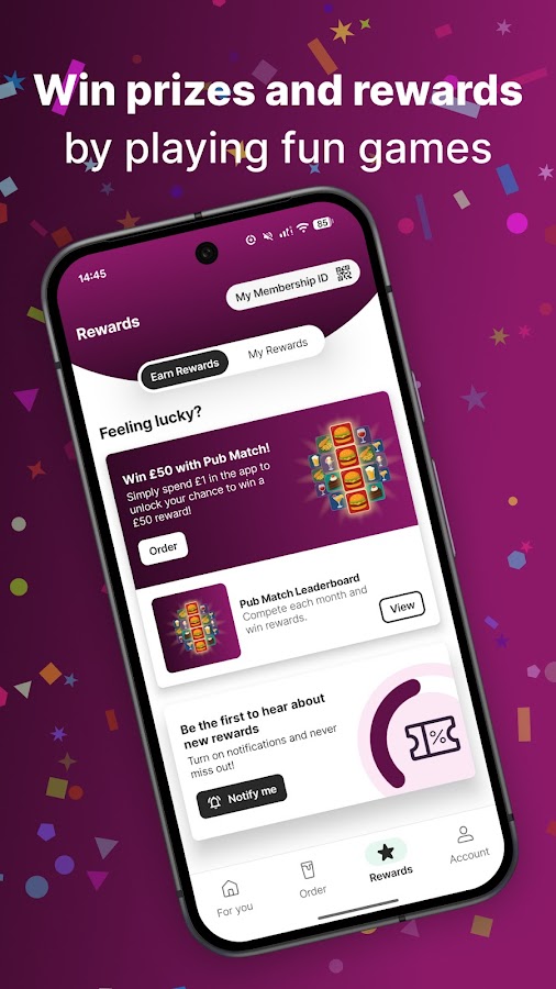 Зарегистрируйтесь и активируйте награды в приложении, чтобы получить доступ к эксклюзивным предложениям, скидкам и бесплатным подаркам, независимо от того, пьете ли вы пинту с друзьями или наслаждаетесь полноценным ужином. Ваши награды хранятся в приложении, поэтому вы можете легко просмотреть их и использовать в любое удобное время. Получите доступ к QR-коду своего идентификатора участника через приложение и загрузите его в Google Wallet для быстрого сканирования при оплате в баре.