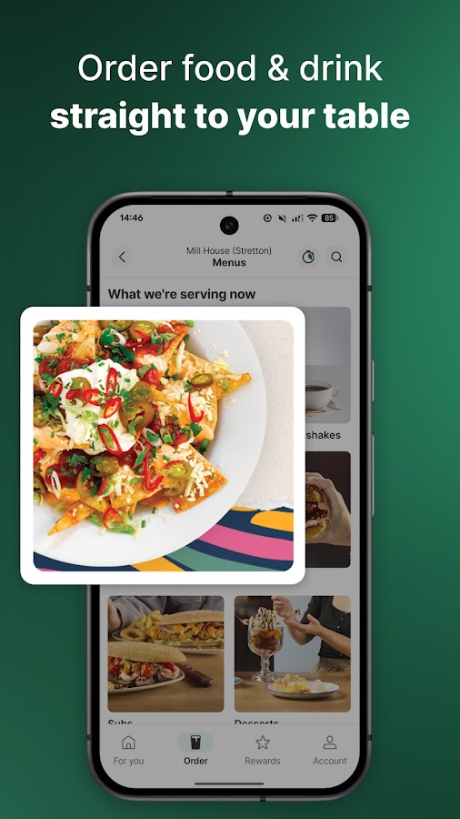 Ознакомьтесь с нашим полным меню вкусных блюд и прохладительных напитков, от сытной пабной классики до любимой пинты, и сделайте заказ, не вставая с места. Оплачивайте быстро и безопасно, используя сохраненные данные карты, или воспользуйтесь Google Pay для удобной бесконтактной оплаты. Следите за временем ожидания, чтобы знать, сколько времени займет ваш заказ. Хотите еще порцию? Закажите напитки одним нажатием.