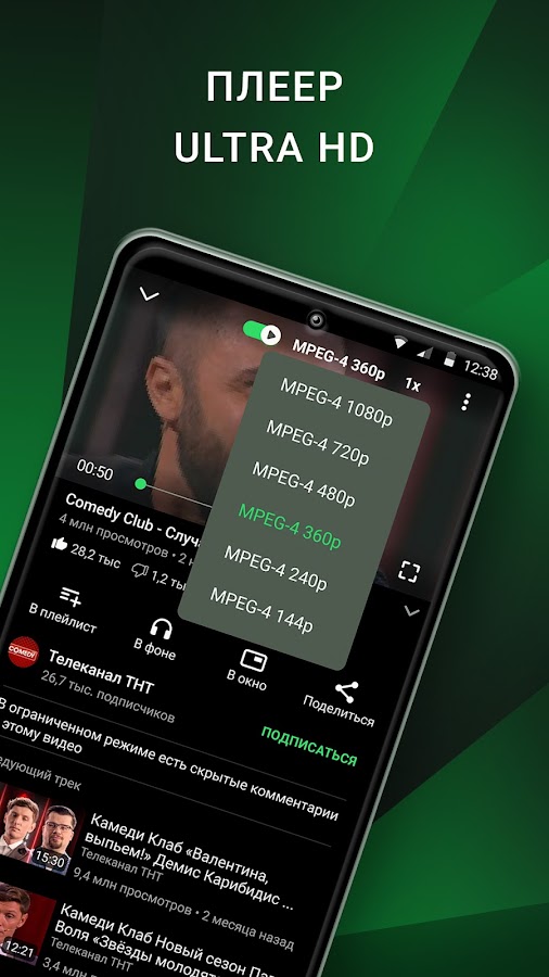 Чтобы сделать ваш пользовательский опыт еще удобнее, в GreenTuber предусмотрена функция проигрывания интересующего вас видео во всплывающем окне. Вы сами сможете выбрать удобный для вас формат просмотра видео: в полноэкранном формате или в виде всплывающего окна, занимающего только часть экрана телефона.