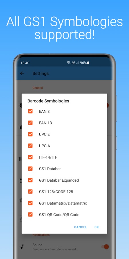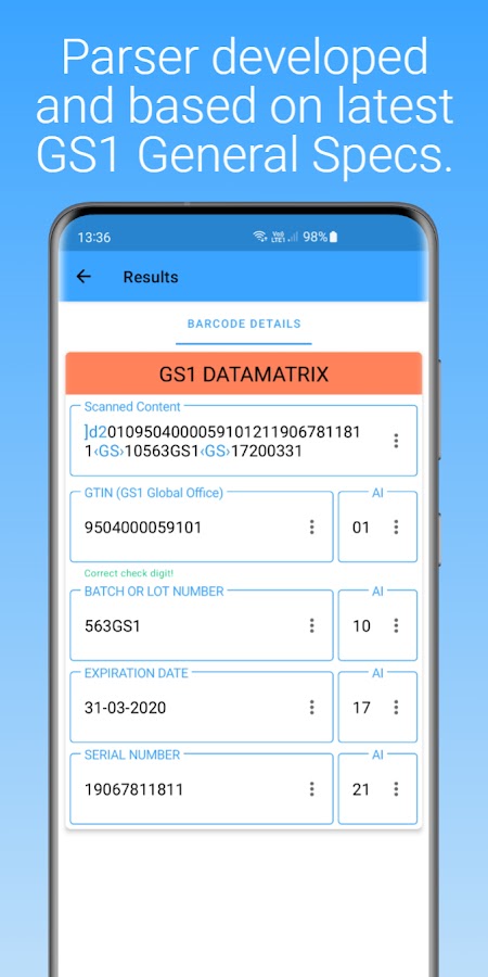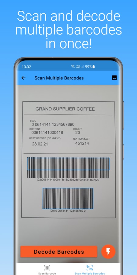 Сканер штрих-кода GS1 оснащен расширенными возможностями декодирования, позволяющими легко декодировать и анализировать широкий спектр символики штрих-кода GS1. Наше приложение поможет вам: от EAN/UPC до GS1-128 и DataBar. Попрощайтесь с ручным декодированием и позвольте нашей технологии сделать всю работу за вас. Но мы не останавливаемся на достигнутом. Откройте для себя будущее технологии штрих-кодов благодаря возможности нашего приложения беспрепятственно декодировать и анализировать QR-коды GS1 Digital Link. Откройте для себя мир расширенной информации о продуктах, возможности отслеживания и взаимодействия с потребителями.