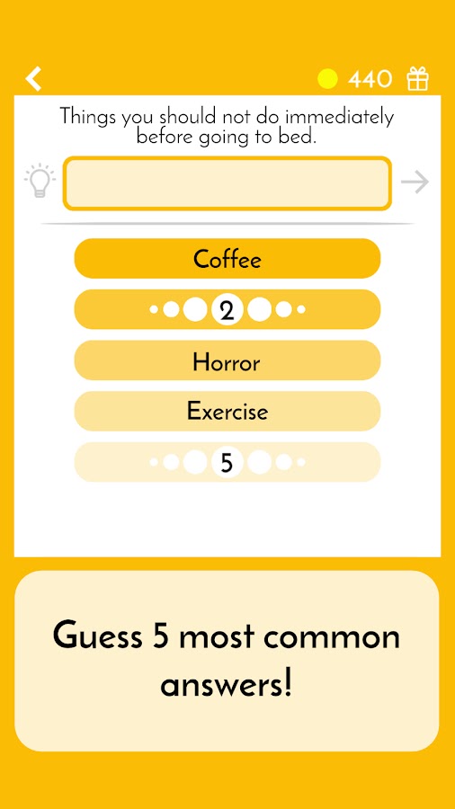 Угадай 5 (Guess 5) – это игра-викторина на русском языке, в которой вам нужно угадать 5 наиболее распространенных ответов на вопросы, составленных на основе мнения 100 человек. Какие мысли первыми приходят вам в голову при ответе на такие вопросы: «Вещи, которые вы никогда никому не одолжите?», «Что бывает только раз в году?» или «Платные вещи, которые раньше были бесплатными?».