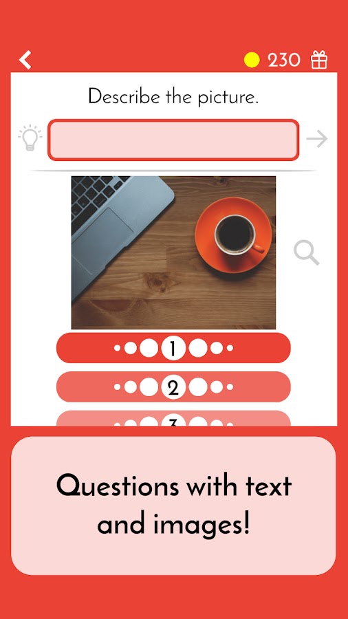 Игра предлагает 75 захватывающих уровней, в которых необходимо ответить на вопрос или описать, что изображено на картинке. Уровни регулярно обновляются, поэтому заскучать вы не успеете!