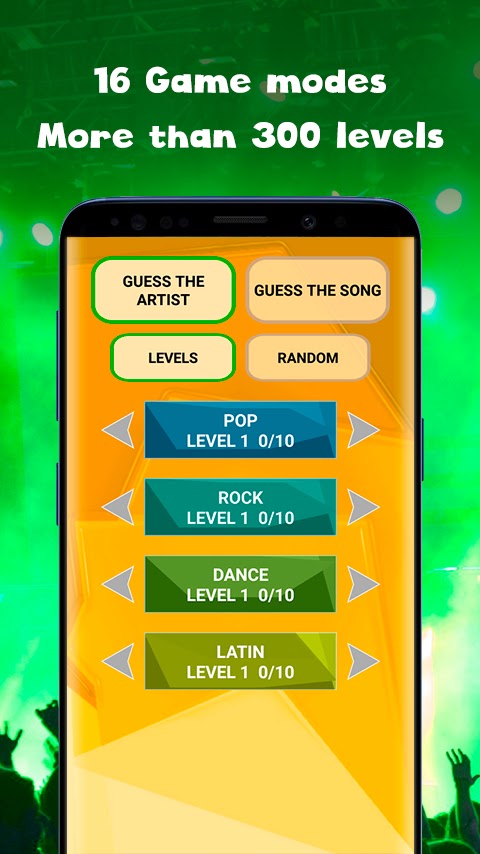 Наслаждайтесь 4 музыкальными стилями этой бесплатной музыкальной игры: POP, ROCK, DANCE и LATIN.